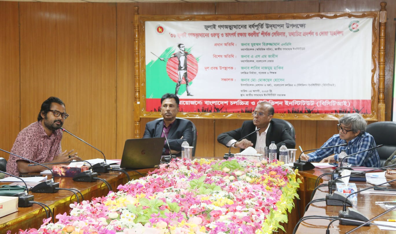 বাংলাদেশ চলচ্চিত্র টেলিভিশন ইনস্টিটিউট (বিসিটিআই) এর আয়োজনে জুলাই গণঅভ্যুত্থানের বর্ষপূর্তি উদযাপন উপলক্ষে "৩৬ জুলাই গণঅভ্যুত্থানের গুরুত্ব ও তাৎপর্য রক্ষায় করণীয়" শীর্ষক দিনব্যাপী সেমিনার আজ (০৪ অগাস্ট, ২০২৫ খ্রি) জাতীয় গণমাধ্যম ইনস্টিটিউট এর সভাকক্ষে অনুষ্ঠিত হয়েছে।